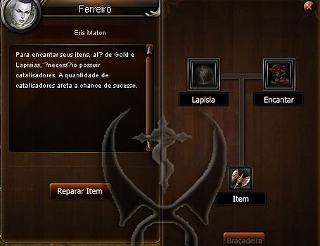 Tendo os 3 em mãos, vá até um ferreiro mais próximo e clique na opção Braçadeira. Você verá uma janela com três slots... Um para seu equipamento, um para a lapisia, e um para o catalisador.